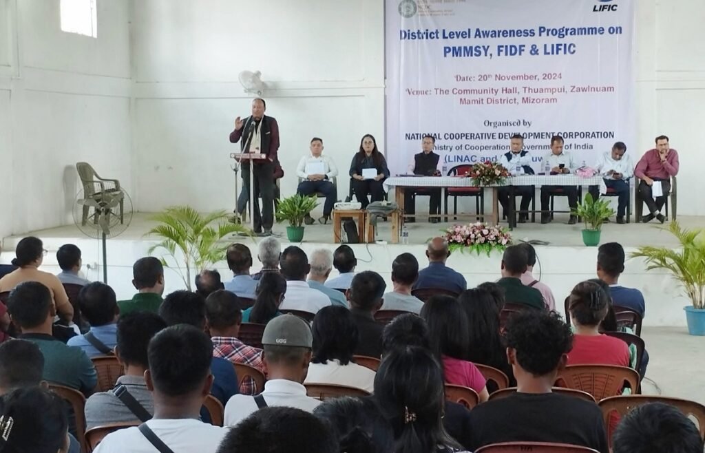 Vawiin khan National Cooperative Development Corporation (NCDC) Ministry of Cooperation, Gov’t of India bultumin Mamit District Level Awareness Programme on PMMSY, FIDF & LIFIC chu  Zawlnuam Thuampui Community Hall-ah hman niin he hunah hian Pu Lalthansanga, Hon’ble Minister, Environment, Forest & Climate Change chu Khuallian niin a hmanpui. Pu Lalthansanga chuan Mizote hi society system a kan kal thiam a tul a, kan ngaihtuahna leh kan thil thlir dan pawh tunlai mil a kan siamrem a tul tawh a ni a ti a. Mizoram Sawrkar chuan Bana Kaih kan a kalpui mek chu induhsak lam a kal pui niloin line department te’n spot verification neiin an zirchian hnuah thlanchhuah an nih dawn thu leh chhungkaw eizawnna atana hma lo lak tawh din thar leh nana hman theih a nih dawn thu a sawi. Minister chuan scheme kan neih te chu hmasawn nan a hman tum zel a nih thu a sawi bawk.