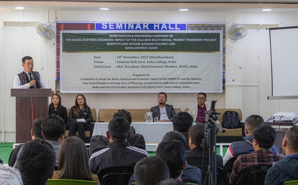 A seminar on the possible social, cultural, and economic impacts of the Kaladan Multi-Modal Transit Transport Project (KMMTTP) Road and the Bairabi–Sairang Railway Line was held today at the Seminar Hall, Government Siaha College. Shri S. Lalremtuanga, Deputy Chief Executive Member (Dy. CEM), MADC, attended the programme as the Chief Guest.Addressing the gathering, Shri S. Lalremthanga stated that development always brings both positive and negative impacts, and therefore it is important not only to recognize the benefits but also to understand how to prevent or minimize adverse effects. He emphasized that the KMMTTP road will have a significant impact on Lai and Mara districts, and hence adequate preparedness is essential. As the project will bring large-scale economic activity, it is important to utilize its benefits wisely while taking responsibility to protect community life, culture, and ethnic identity.