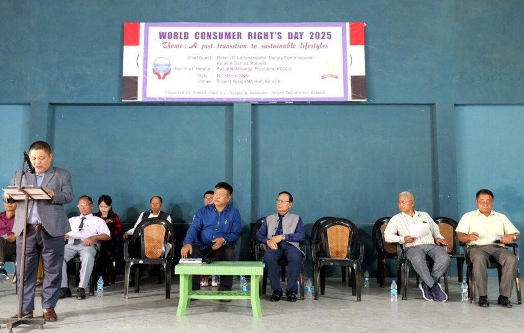 Vawiin khan Kolasibah District Food, Civil Supply & Consumer Affairs Department leh Kolasib District Consumers’ Union (KODCU) te buatsaihin World’s Consumer Rights Day 2025, Kolasib Project Veng YMA Hall-ah hman a ni a. He hun hi Kolasib Deputy Pu Robert C. Lalhmangaiha chu khuallian niin hun a hmanpui a ni. Kolasiba World’s Consumer Rights Day ah hian Khuallian Kolasib DC Pu Robert C. Lalhmangaiha chuan Consumers-te’n an dikna leh an chanvo an hriat a pawimawh thu sawiin, FCS&CA Department-ah hun engemaw chen chu amah ngei pawh Deputy Director a nih tawh thu sawiin State Consumer Dispute Redressal Forum leh District Consumer Dispute Redressal Forum kan neihte ah thubuai an chin fel theih tawk chinah hma nasa takin lak a nih thin thu a sawi lang.